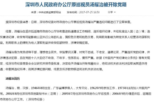政知圈(微信ID:wepoliti策展cs)注意到,近些年來,落馬的巡視員還真不少。這不,就在7月25日,深圳市政府辦公廳原巡視員湯耀治被開除黨籍。